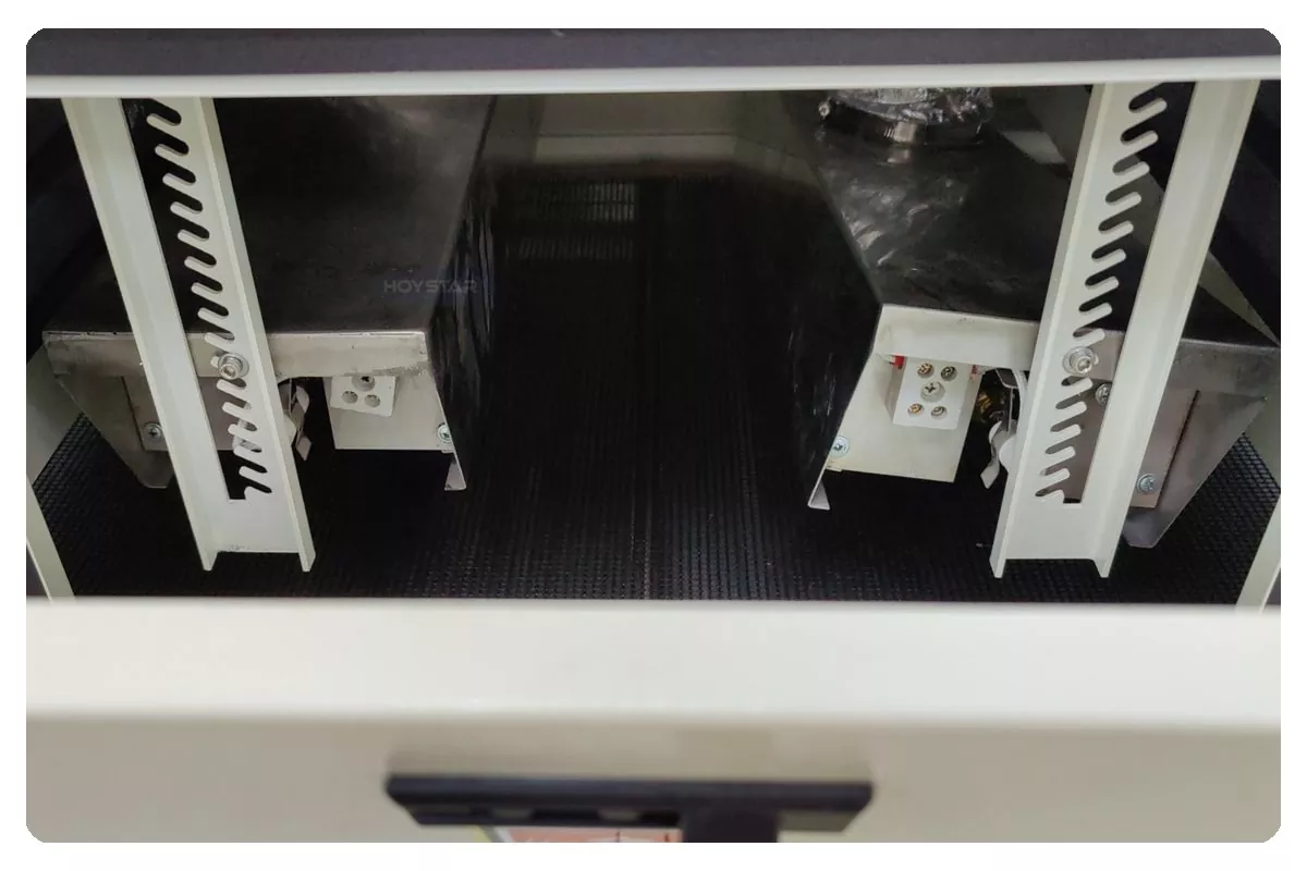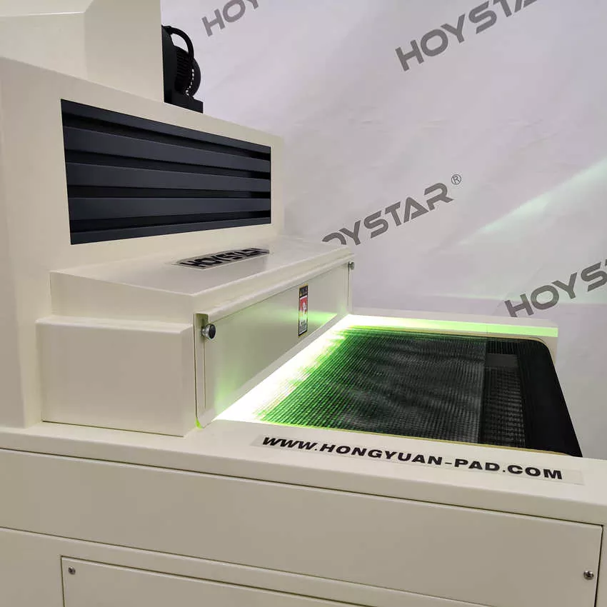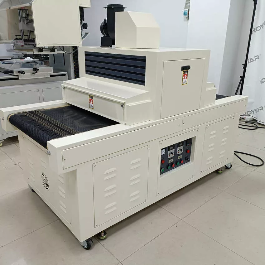 Çin'deki profesyonel üretici olarak, size yüksek verimli HOYSTAR 1000mm Genişlik Konveyörlü UV Kürleme Makinesi sunmak istiyoruz; makine, kağıt, PVC ve diğer yumuşak veya ince yüzeyler de dahil olmak üzere çeşitli malzemeler üzerine basılmış UV mürekkebini kurutmak için uygundur. Sorunsuz UV mürekkep kürlemesi sağlamak için makine serigrafi yazıcılara kolayca bağlanabilir. İstikrarlı performansı ve geniş uyumluluğuyla, müşterilerin farklı baskı uygulamalarında profesyonel kürleme ihtiyaçlarını etkili bir şekilde karşılar.