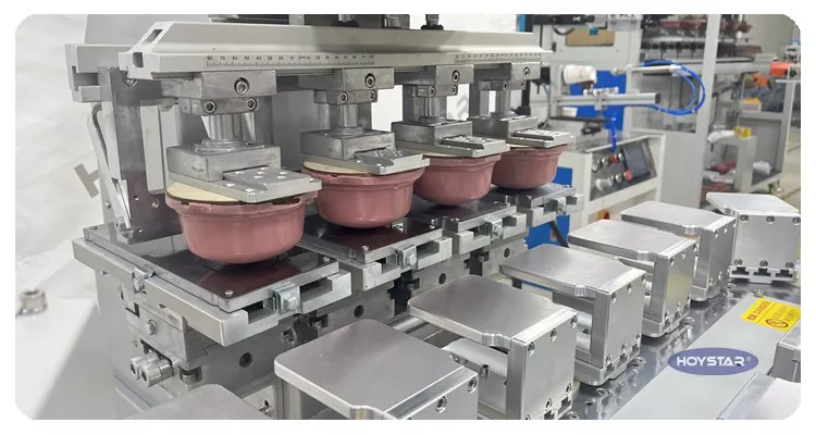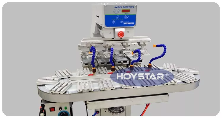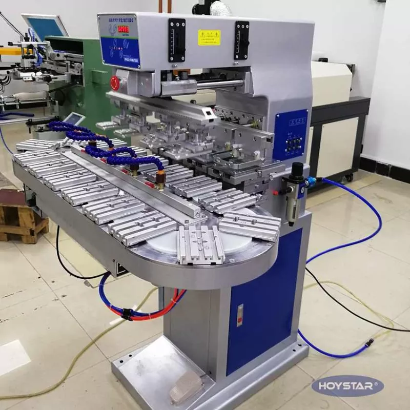 Çin'deki profesyonel üretici olarak size yüksek verimli HOYSTAR Büyük Boy Dört Renkli Konveyörlü Tampon Yazıcı sunmak istiyoruz. Ürünlere sürekli dört renkli tampon baskı yapabilen bu makine, renk kaydını tek çevrimde tamamlayabilmektedir. Bu makine, baskı süreci boyunca sürekli ve sorunsuz ürün aktarımına olanak tanıyan, tam 4 renkli üst baskıyı tek bir döner döngüde tamamlayabilen döner döner tabla taşıma sistemini benimser. Mekik tipi tampon yazıcılarla karşılaştırıldığında hızı çok yüksektir.